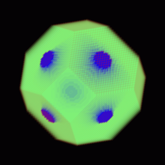 The data within the BZ was created using a self-written LMTO code, and the visualization was done using Vis5D. The only information needed to calculate the Fermi surface is the bandstructure and the Fermi energy. The material used for this calculation is copper in the fcc crystal structure.