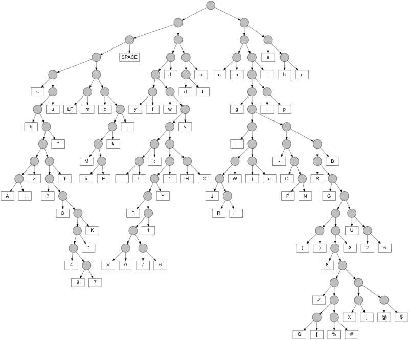 Finally, let's say we want to compress the size of the ASCII file for the book Pride and Prejudice, by Jane Austen. After counting the frequencies of all symbols, we get the Huffman tree below.